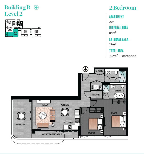 Celeste的室内精美实用。起居室、餐厨和浴室都铺设了典雅且耐用的600x600毫米石质地砖,并采用隔音隔热效果更佳的声学玻璃以及Hebel间隔墙系统。厨房配备充足收纳空间。