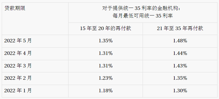 对于还款期在20年及以下、贷款额在90%及以下的贷款,2022年5月的利率在1.350%至2.410%之间,最常见的利率为1.350%。如果借款人的融资比例超过90%,5月份的利率在1.610%到2.670%之间,大多数银行提供的利率都较低。