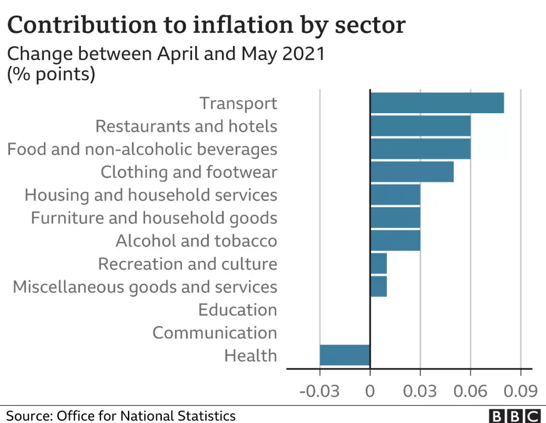 负责经济统计的统计员说:“此次上涨具有普遍性,由于人们需求的增加,导致行业内价格上涨,但其中部分上涨是暂时的,例如燃料价格上涨导致通胀继续上升,这也是因为此前疫情使燃料价格达到低点。”