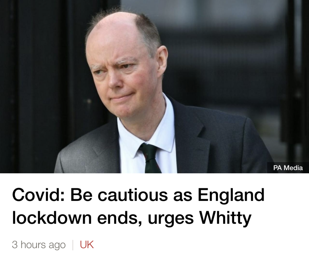 克里斯·惠蒂教授表示,目前英国“还没有走出困境”,但英格兰的针对新冠疫情采取的限制措施将于下周一完全结束,人们更应该谨慎行事。